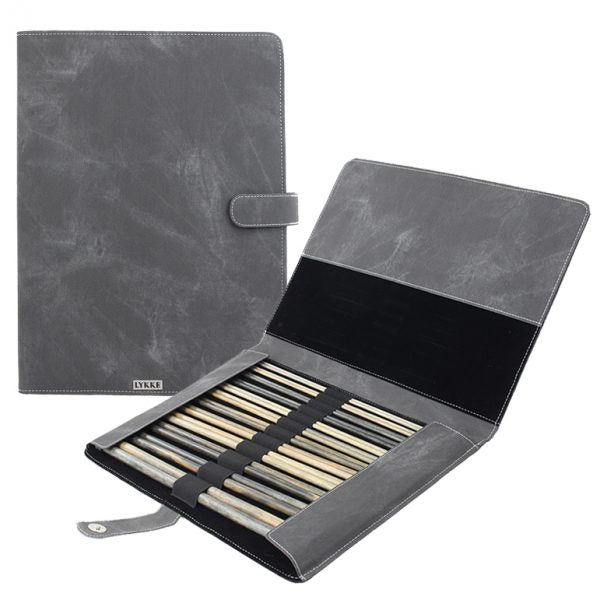 Beautiful set containing 12 pairs of straight, single pointed knitting needles nestled securely into a charcoal faux denim folding case. The needles are made of smooth, hard, birch wood with a beautiful grey "driftwood" finish that varies with the wood grain an the tips are long and slender.